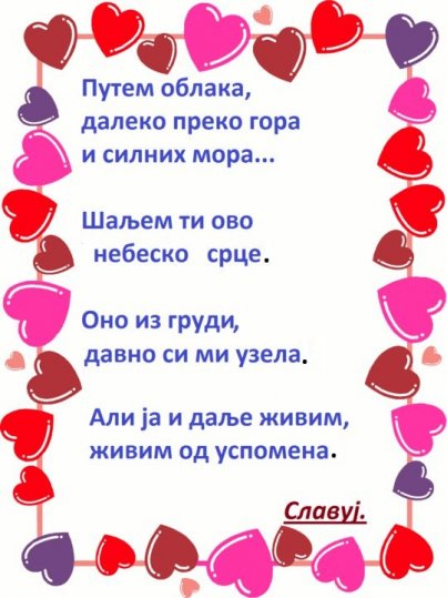 Наравно да увијек полазим од себе. Увијек ће постојати неке особе са којима се нисам видио, а ни чуо, па брат брату да каже и по неколико година, али то не значи да сам их заборавио и да не мислим на њих. Не! То се неће десити! И зато, остављам по страни фразу - "Далеко од очију, далеко од срца", јер никада нећу прихватити да су ми многе особе ишчезле из срца и из памћења, без обзира што их не виђам као некад и што са њима нисам стално и заједно, онако као некад. Много је разлога утицало на то.