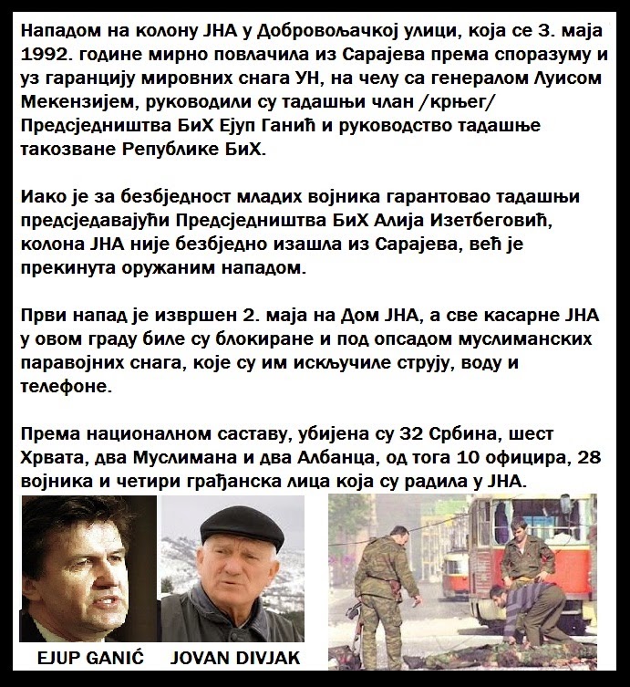 Ганић и даље као папагај понавља већ излизану матрицу да су се у мају 1992. године у Добровољачкој улици у Сарајеву сукобиле двије војне формације - Територијална одбрана БиХ и бивша ЈНА и да је том приликом погинуло пет или шест људи.
