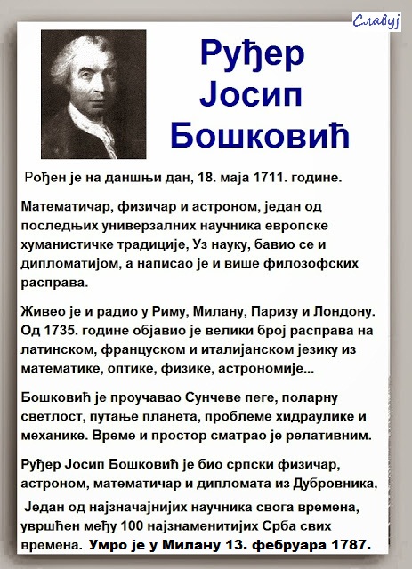 Руђер Јосип Бошковић је рођен у Дубровнику 18. маја 1711. године. Умро је у Милану 13. фебруара 1787.