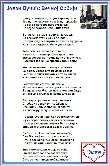 Пјесму “Вечној Србији” Јован Дучић је написао 1943. године, пред саму смрт.