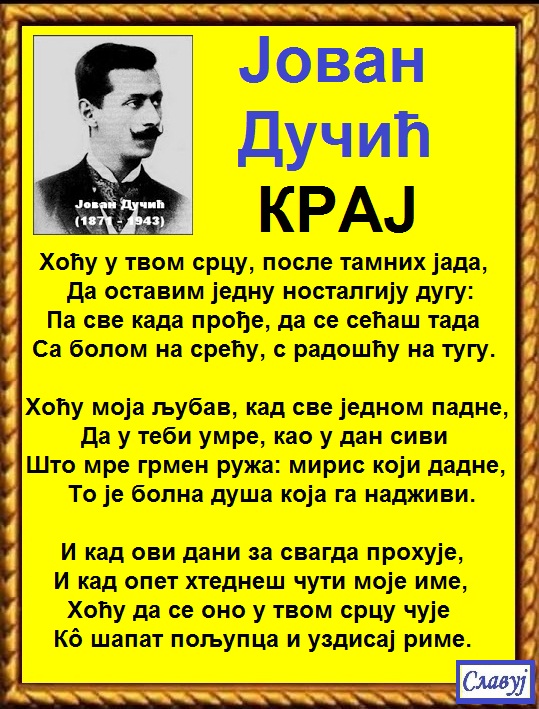 Пјесник и дипломата Јован Дучић преминуо је, након краће и тешке болести (шпанска грозница), 7. априла 1943. године у 1 час и 30 минута у Герију, држава Индијана. Био је у 75-ој години живота и имао је статус активног посланика Краљевине Југославије.