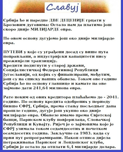 Да овом случају пљачке Србије додам и ово: Многи кажу да се у вријеме владавине злочинца Јосипа Броза добро живјело и управу су, али ево како. Да би сачувао мир и "благостање" народа - злочинац Броз нас је до грла задуживао и његове дугове мораћемо да враћамо још двије деценије.
