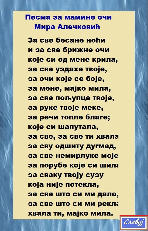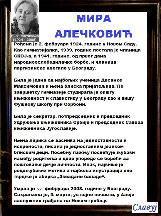 27. фебруара 2008. године славна српска пјесникиња МИРА АЛЕЧКОВИЋ