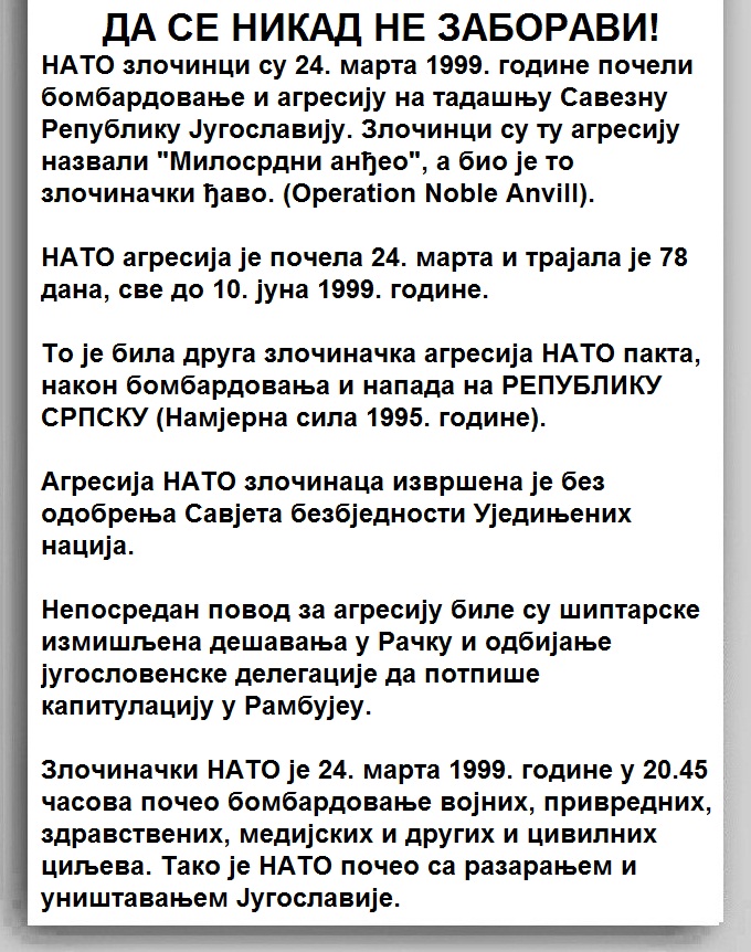 У славу и част свим невино страдалим од злочиначког НАТО пакта и свих српских непријатеља који су силом, пушком и моћи извршили злочиначку агресију на малу, али часну и јуначку Србију.