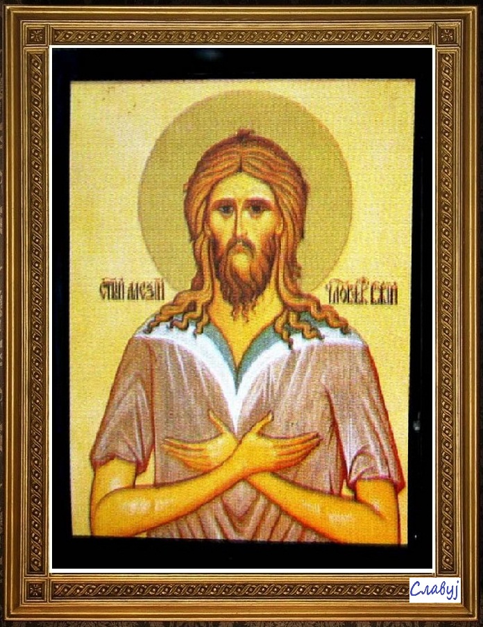Но он те исте ноћи остави не само жену него и дом оца свога, седе у лађу и дође у град Едесу у Месопотамији где беше чувени лик Господа Исуса, послат од самог Господа цару Авгару. Поклонивши се томе лику Алексије се обуче у одело просјака и као просјак живљаше седамнаест година у том граду, непрестано молећи се Богу у паперти цркве Пресвете Богородице. Када се ту прочу као богоугодник, он се убоја од људске славе и оде одатле, седе у лађу да иде у Лаодикију, но промислом Божјим лађа би занесена и доплови чак до Рима. Сматрајући то као прст Божји, Алексије смисли да иде у дом оца свога и да као непознат ту продужи живот свој и подвиг. Отац га не позна, но из милосрђа дозволи му да у дворишту његовом у једној изби живи. Ту Алексије проведе још седамнаест година живећи само о хлебу и води. Злостављан од слугу на разне начине он отрпе све до краја. А када му се крај приближи, он написа једну хартију, стеже у руке, леже и издахну 17. марта 411. године.