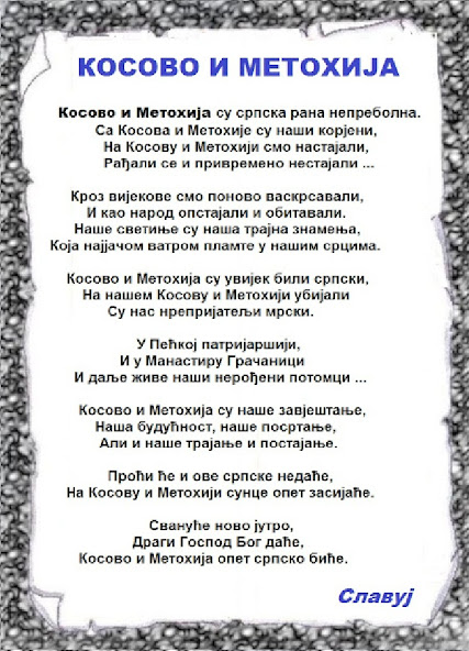 И другом речју. Док је Европа постајала Европом, ми смо били ограда њена, жива и непробојна ограда, дивље трње око питоме руже. На Видовдан 1389. године српски кнез Лазар са својом храбром војском стао је на Косову Пољу, на браник Хришћанске Европе, и дао живот за одбрану Хришћанске културе. У то време Срба је било колико и вас Енглеза. Данас их је десет пута мање.