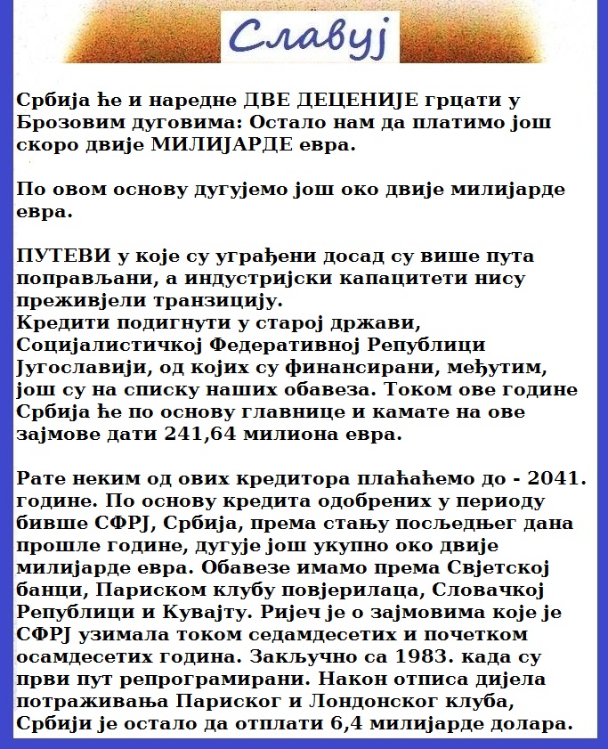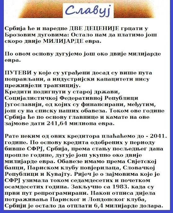 Ко је раскомадао некадашњу Југославију и ко је кад год је могао најдубље забијао нож Србима. Србија и српски народ ће и у будућности крварити због своје наивниости и вјеровања у такозвано братство и јединство. Кад Срби схвате да љубави у свијету нема, већ да се цијели свијет и цивилизација одржавају само на ИНТЕРЕСУ, е тада ће и Србима бити лакше да опстану на овој свјетској вјетрометини и у балканској вукојебини.