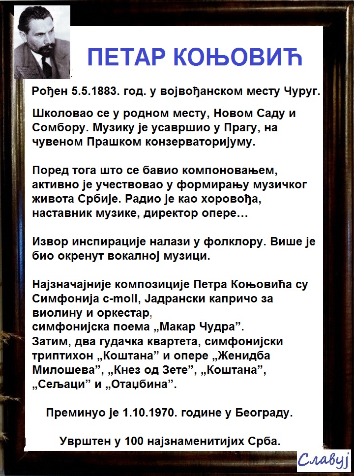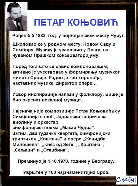 5. маја 1883. године рођен је српски композитор и музички писац Петар Коњовић, ректор Музичке академије у Београду, члан Српске академије наука и уметности и управник Музиколошког института ("Кнез од Зете", "Вилин вео", "Коштана", "Сељаци").