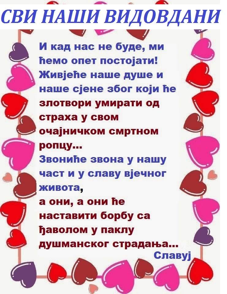 Сваки пламен прислужене свијеће нек' освијетли врата небеског раја за све упокојене душе видовданског страдања и погрома нашег постојања, који над српским родом непријатељи учинише, али који нас никада не сломише.