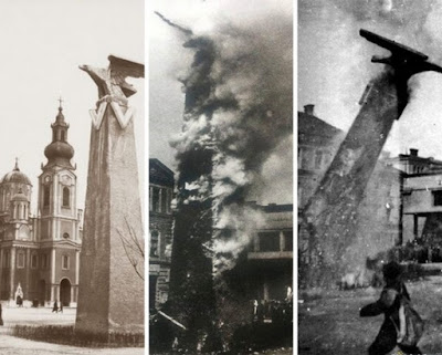Овај споменик је запаљен и срушен 1945. године, тако да је и тај симбол преурањене самоувјерености уклоњен са новим идеолошким поретком и диригованим сјећањем.