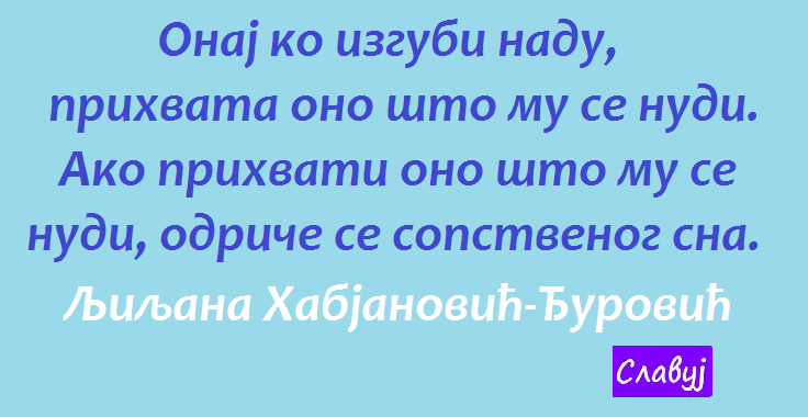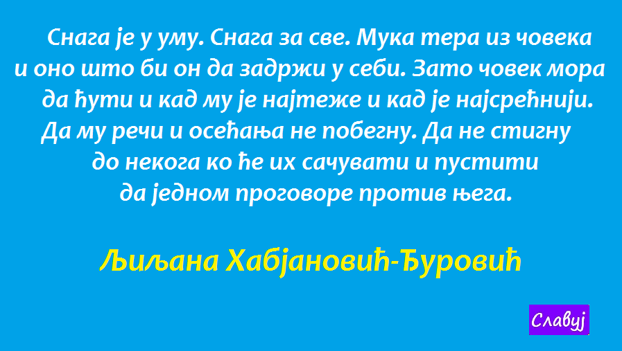А кад се покуша то сазнање ставити у ријечи, онда се свака ријеч задихано откида, силовито отрже: она би да се испне у галопу ка орловскоме гнијезду које се скаменило изнад вртлога људског-као бијела поносита челенка, која кити цијелу мрку и плаху Црну Гору, што се стрмогљавује на све стране безданим урвинама и суморним шиљцима. Тако, закићена калпака, као старински косовски витез-Црна Гора излази пред Бога и пред људе, пркоси, горди се, ратује кроз историју и игра са судбином.