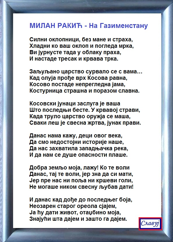 Написано у славу и част српских јунака и Видовдана Љета Господњег, 28. јуна 2009. године. --------------------------
