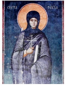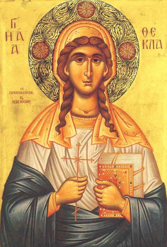 Света првомученица Текла равноапостолна. Рођена у Иконији од родитеља знаменитих али незнабожачких. Као осамнаестогодишња девојка била верена за некога младића у оно време, када апостол Павле дође са Варнавом у Иконију на проповед Јеванђеља.