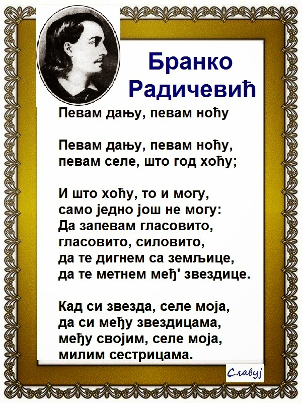 О, песме моје, јадна сирочади, Децо мила мојих лета млади'! Тедох дугу да са неба свучем, Дугом шарном да све вас обучем, Да накитим сјајнијем звездама, Да обасјам сунчаним лучама ...