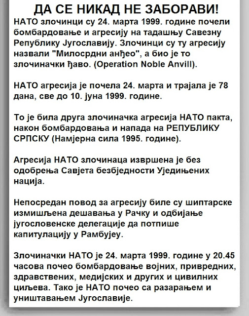 ЗЛОЧИНАЧКА НАТО АГРЕСИЈА НА СРБИЈУ - ДА СЕ НИКАД НЕ ЗАБОРАВИ!