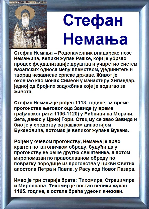 Стефан Немања је био велики жупан Рашке, родоначелник владарске династије Немањића и творац моћне српске државе у средњем вијеку Умро је 26.2.1199. године.