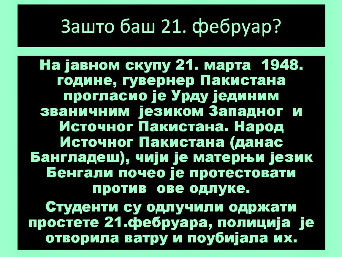 Генерална скупштина Унеска прокламовала је 1999. године Дан матерњег језика, као сјећање на студенте који су 21. фебруара 1952. године убијени у Даки у Источном Пакистану, данас Бангладешу, јер су протестовали зато што њихов матерњи језик није проглашен за званични.